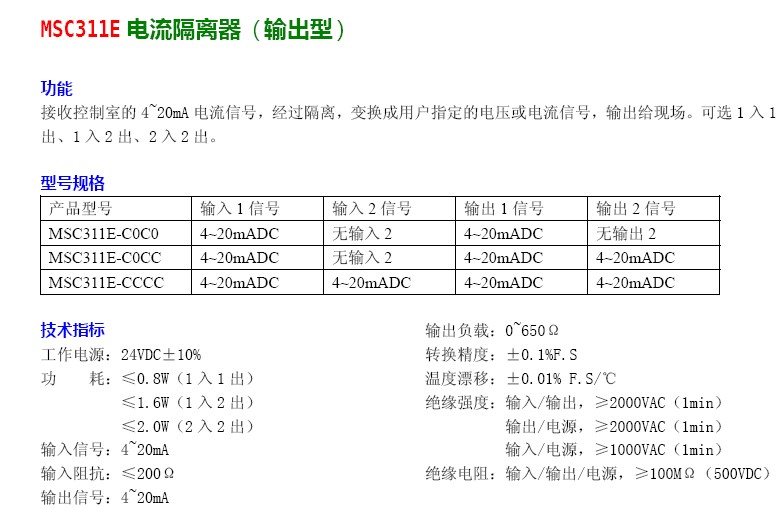 MSC311E-C0C0,MSC311E-C0CC,MSC311E-CCCC,电流隔离器(输出型)