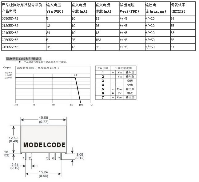 G系列 GxxxxS-xW 6KVDC隔离 0.1W ~2W 稳压正负双输出 SIP7脚封装