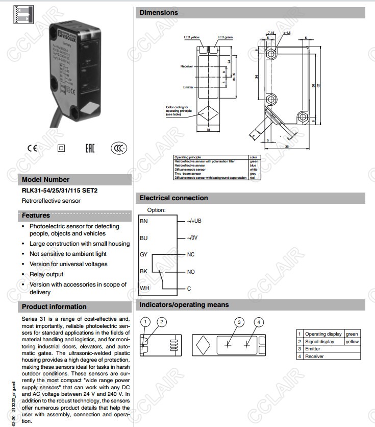 RLK31-54/25/31/115-SET2,RLK31-54/25/31/33/115-15M,反射板型传感器