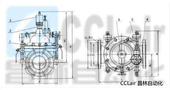 1、球阀2、导阀3、流量调节阀4、主阀5、压力表6、针阀