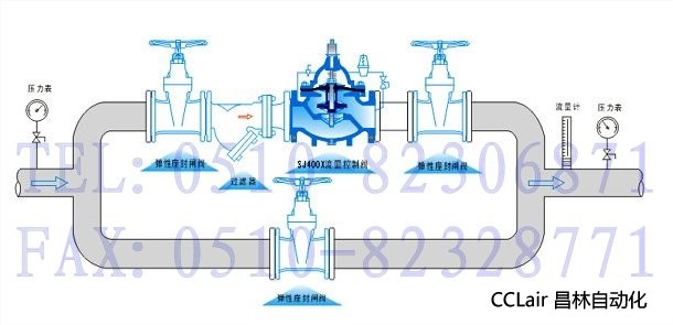 400X流量控制阀由主阀、流量调节阀、针阀、导阀、球阀、微形过滤器和压力表组成水力控制接管系统。利用水力自动操作,控制和调节主阀开度,使通过主阀的流量保持不变。