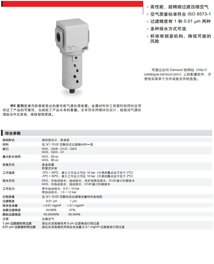 MX2-3/8-FC00,MX2-1/2-FC03,MX3-1/2-FC05,MX3-3/8-FC08,camozzi聚结式过滤器
