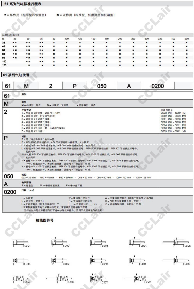 61M1P032A0100,61M2P050A0200,61M3P063A0250,61M4P080A0300,61M5P0125A0400,61N6P0100A0320,camozzi气缸