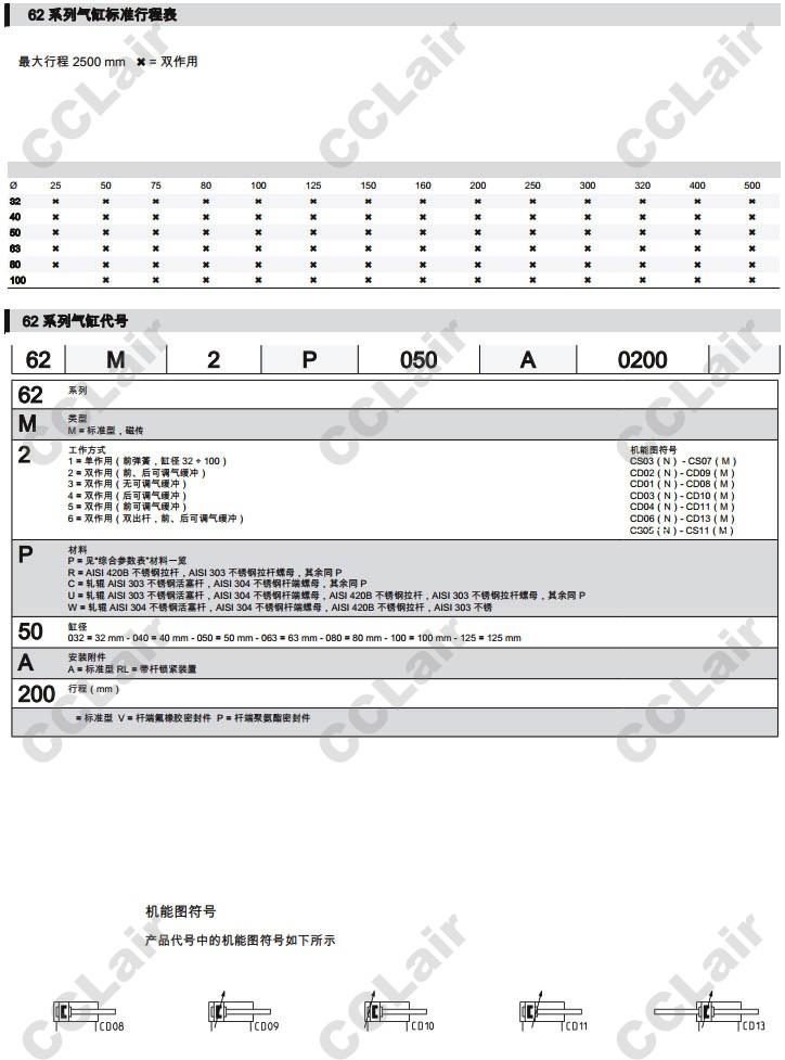 62M1P032A0100,62M2P050A0200,62M3P063A0250,camozzi气缸