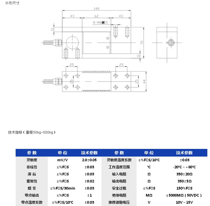该传感器弹性体采用弯曲悬臂梁结构,一端固定,一端受力,结构强度好,可用于各种拉伸力和压缩力的承载和测量。具有:精度高、性能稳定可靠、安装使用方便等特点。适用于电子秤、衡器等各种测力、称重的工业自动化测量控制系统。
