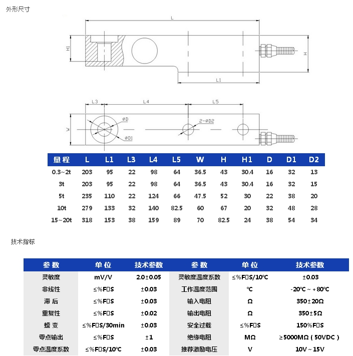 该传感器弹性体采用剪切悬臂梁结构,一端固定、一端受力,外形高度低,结构强度高,可用于各种拉伸力和压缩力的承载和测量。具有防尘密封、量程范围广、精度高、性能稳定可靠、安装使用方便等特点。适用于电子秤、衡器等各种测力、称重的工业自动化测量控制系统。