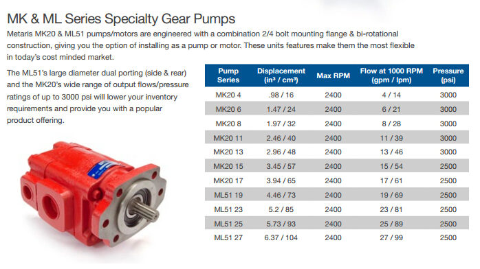 MK204,MK206,MK208,MK2011,MK2013,MK2015,MK2017,ML5119,ML5123,ML5125,ML5127,Metaris齿轮泵