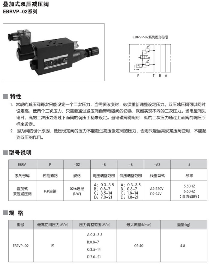 EBRVP-02-A,EBRVP-02-B,EBRVP-02-C,EBRVP-02-D,EBRVP-02-A-A-A2,EBRVP-02-D-D-D2,叠加式双压减压阀